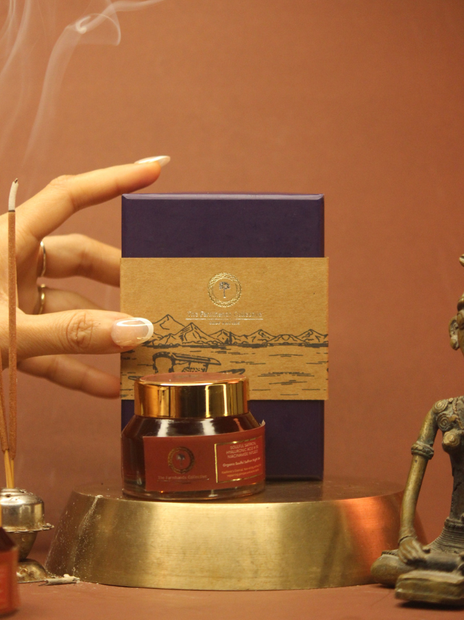 Welcome to the golden ritual of night skincare. It is a luxurious, organic, and soulful saffron night gel, curated by Mongra Saffron from the purest valley in Kashmir. This premium saffron gel for the face is crafted with Ayurvedic medicinal plants and is clinically proven to contain ingredients such as HYALURONIC ACID and 5% NIACINAMIDE. The saffron gel is specifically designed for the face, applied at night while sleeping, to help brighten the complexion, reduce pigmentation, and deeply hydrate the skin. Every batch of the saffron gel is carefully curated with powerful plants and strict care to provide fresh skin and a healthy feeling, combining natural purity with modern science.