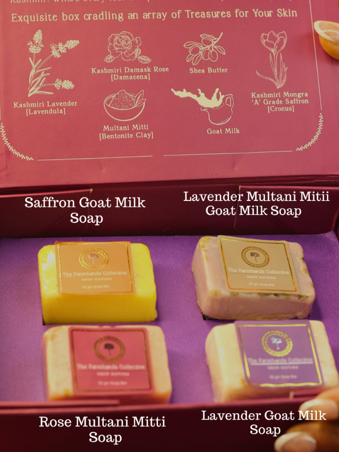 Ingredients: Damask Rose, Kashmiri Mogra Saffron, Kashmiri Lavender Essential Oil, Lavender Flowers, Goat Milk, Multani Mitti.