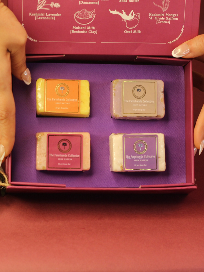 Discover the nourishing goodness of the Pushpa Prakshalan - Lux Bathing Ritual. This exquisite collection of Kashmiri Goat Milk Soaps features four distinct varieties, each designed to pamper your skin with the power of natural ingredients. Renowned for its moisturizing benefits, creamy goat milk makes these soaps perfect for all skin types.